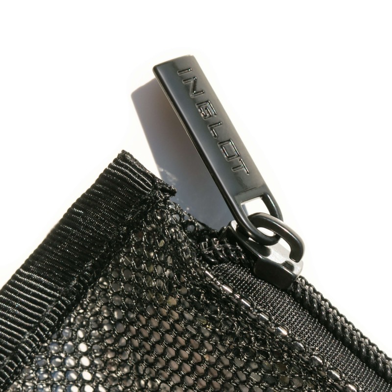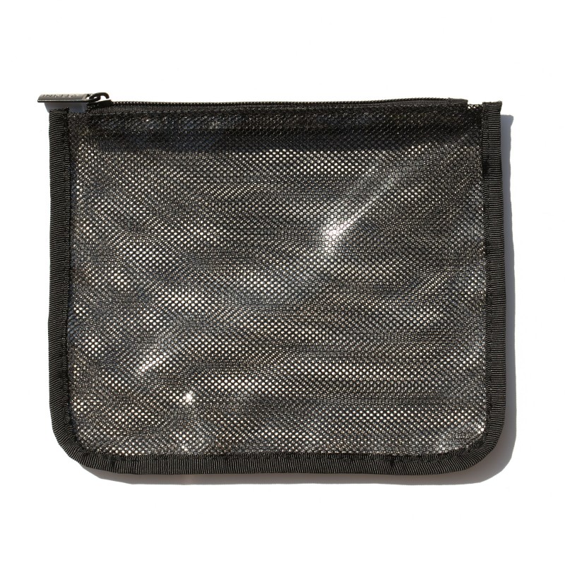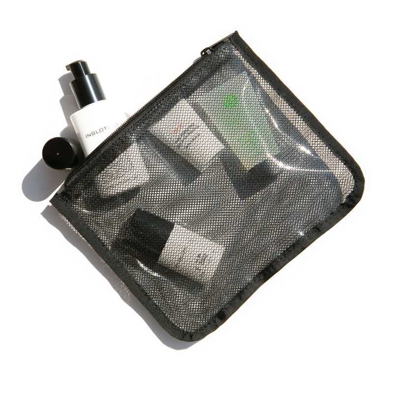 A handy bag for small cosmetics and accessories. It is made of clear material covered with a fine black mesh through which you can see the contents. Locked with a zipper, it is extremely practical and perfectly stores all your beauty essentials.